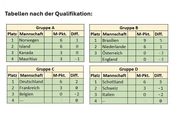 Nachdem am Samstag alle Spiele durchgeführt und die Ergebnisse in einer Tabelle eingetragen wurden konnten die Platzierungen festgestellt werden. Die zwei erstplatzierten der beiden Gruppen qualifizierten sich für die Finalrunde am Sonntag.