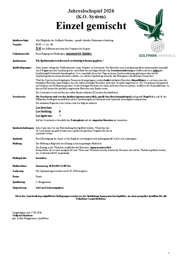 Teilnahmeberechtigt sind alle Mitglieder des Golfpark Hainhaus mit einem HCPI von +5 bis -36.
